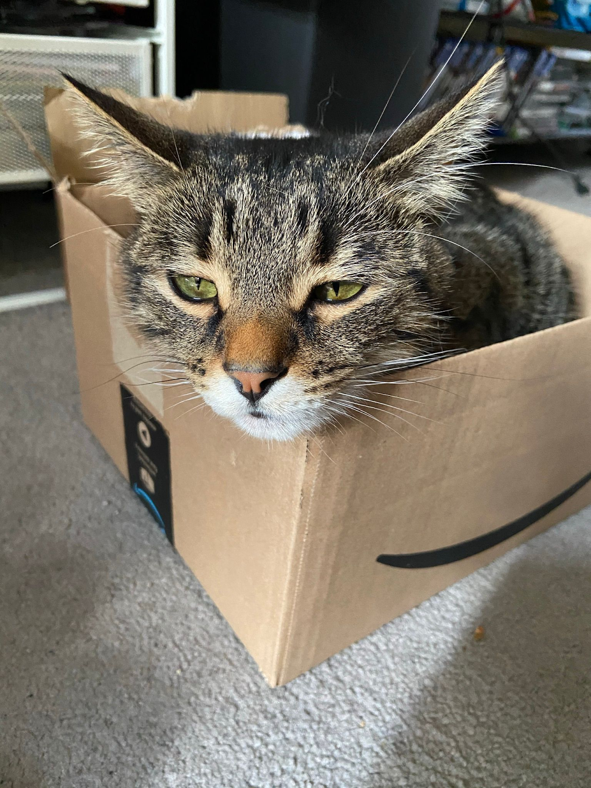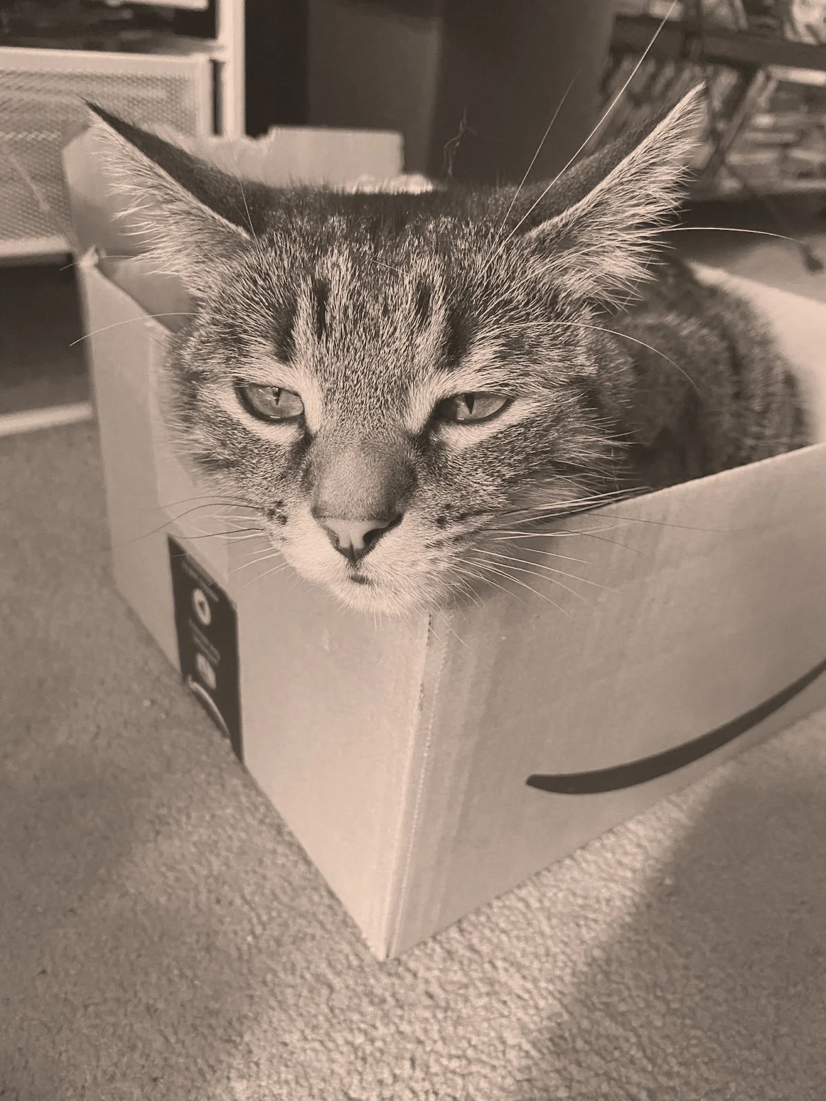Bert is a five-year-old Tabby, who resides with his brother, Buster, and his begrudgingly adopted sister, Gypsy Mae. He enjoys long naps on the windowsill, empty boxes, and refusing affection from his humans. His goal is to one day catch the laser, training daily to achieve this feat.