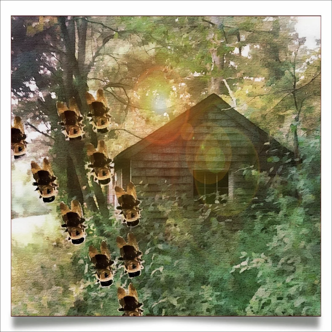 I honest to God reckoned I was done for, and if dying would stop the horrific bee talk that circled around me like bob wire, then let it come quick like. As the girl’s droning buzz grew to an unbearable, high-pitched whine, I looked up from my knees and seen two things – the boy beat it into the cabin and shut the door, and a massive swarm of genuine, bona fide bees come flying out of a hole in the old hickory.